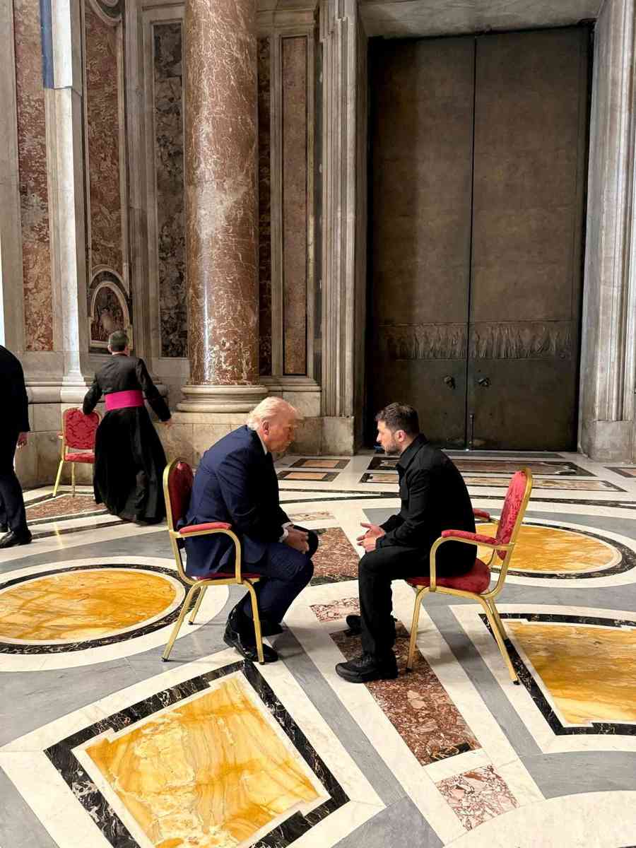 Zelenskiy’s office released photographs of the Rome meeting. In one, the Ukrainian and U.S. leaders sat opposite each other in a large marble-lined hall, around two feet apart, and were leaning in towards each other in conversation. No aides could be seen in the image.