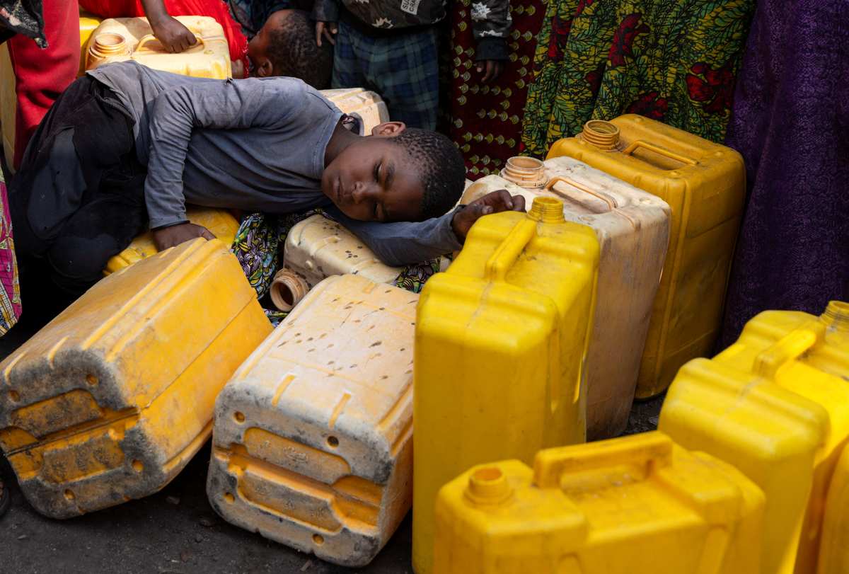 A child sleeps on plastic jerrycans as people queue at the standpipe, where incomplete water connections caused by USAID funding cuts to the NGO Mercy Corps have led to ongoing water shortages, in Goma, North Kivu province, Democratic Republic of Congo, June 16, 2025.