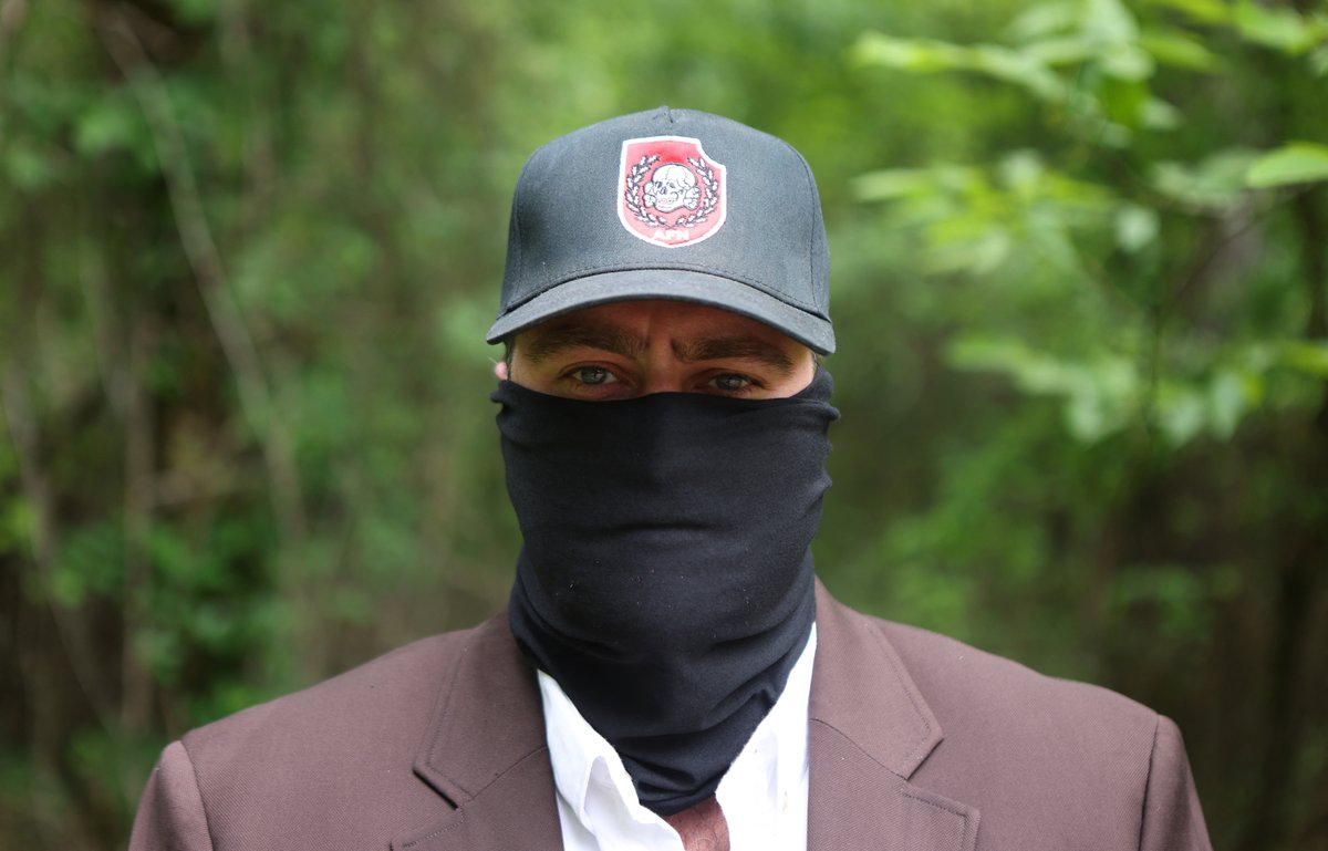 In another echo of the Klan, its signature cross burnings, swastikas are set alight at AFN gatherings. In an AFN video posted online, Stout stands on the bed of a pickup truck, masked and flanked by armed guards, arm raised in a Nazi salute.