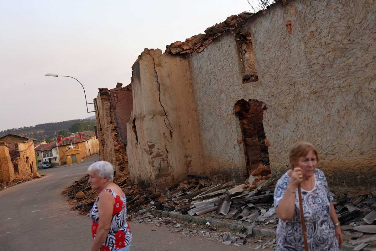 Residents walk near the debris of burnt-out houses after a wildfire in the village of Palacios de Jamuz, near Astorga, Spain, August 17, 2025.