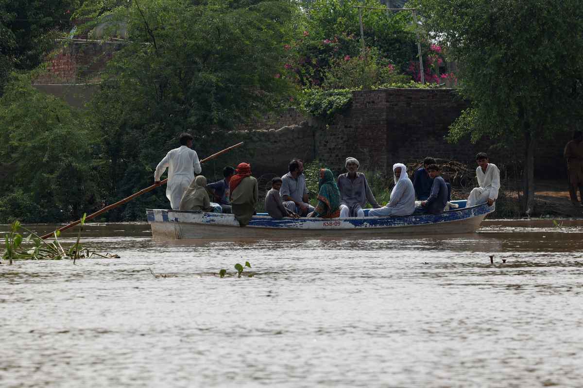 Residents use a boat to reach their destination in flooded areas due to the monsoon rains and rising water level of the Sutlej River, in Hakuwala village near the Pakistan-India border in Kasur district of the Punjab province, Pakistan August 23, 2025.