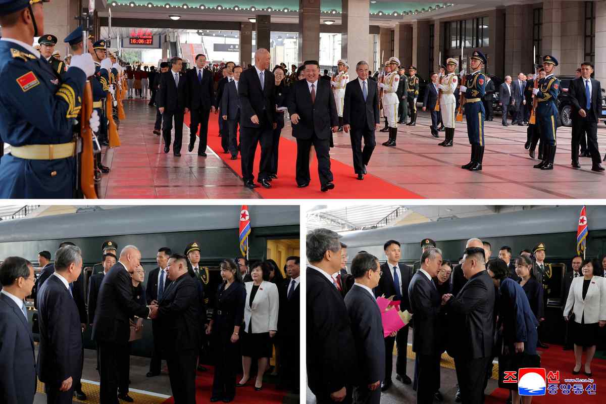 A combination picture released by the Korean Central News Agency on September 2, 2025, shows North Korean leader Kim Jong Un walking (top), and being greeted next to his daughter Kim Ju Ae by Director of the General Office of the Chinese Communist Party (CCP) Cai Qi (bottom left) and Chinese Foreign Minister Wang Yi (bottom right), after his arrival in Beijing, China.