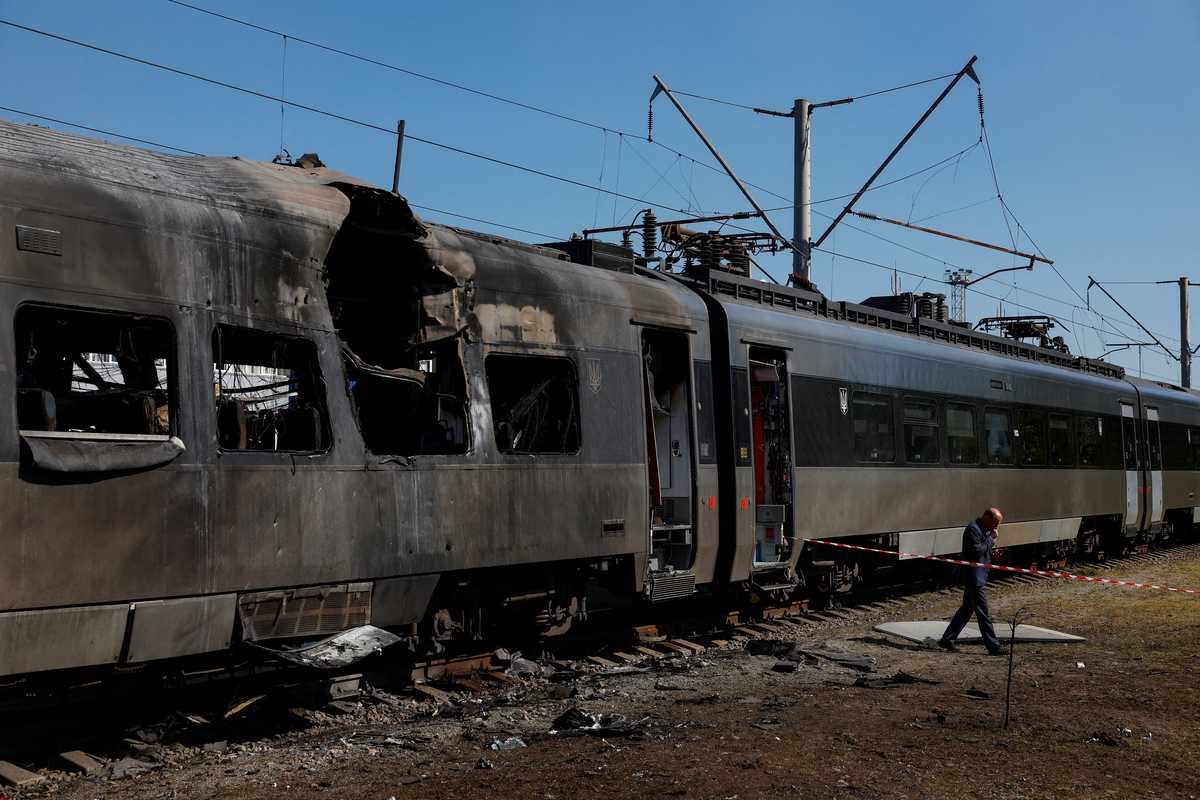 An engineer walks next to a Ukrainian Railways HRCS2 Hyundai Rotem train which was hit by a Russian drone strike, amid Russia’s attack on Ukraine, in Kyiv, Ukraine August 28, 2025.