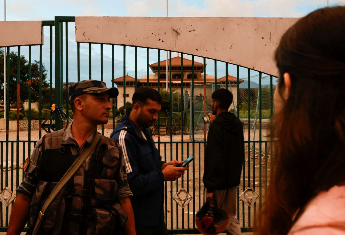A member of the Armed Police Force (APF) stands guard in front of the main gate of the vandalised Parliament as a man takes photos through the closed gate of the vandalized Parliament during the candlelight vigil in memory of people who died during the protest against anti-corruption triggered by a social media ban, which was later lifted, in Kathmandu, Nepal, September 13, 2025.