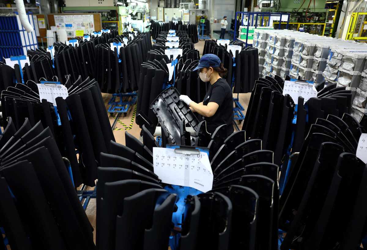 An employee works on the assembly line at Nanjo Auto Interior, a manufacturer of inside door panels and other parts for Mazda Motor, in Akitakata, Hiroshima Prefecture, Japan July 14, 2025.