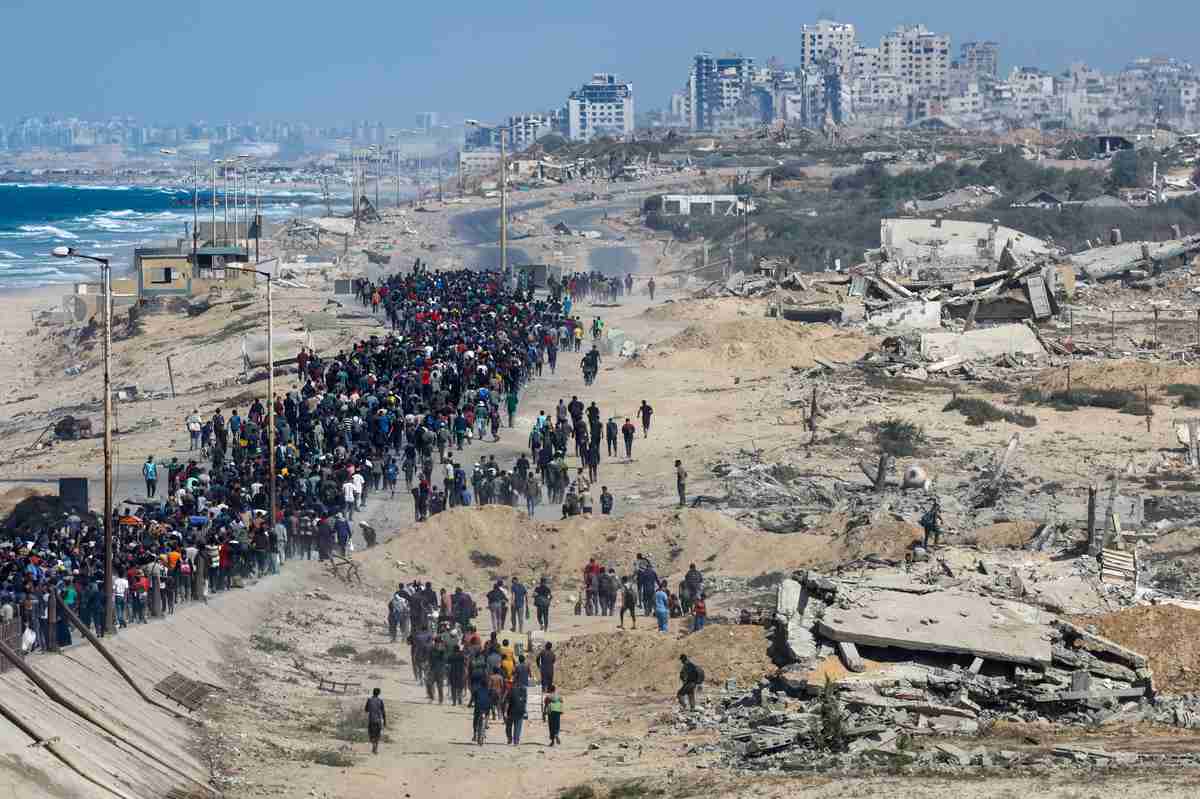 Palestinians, who were displaced to the southern part of Gaza at Israel’s order during the war, walk along a road past destroyed buildings as they attempt to return to the north after a ceasefire between Israel and Hamas in Gaza went into effect, in the central Gaza Strip, October 10