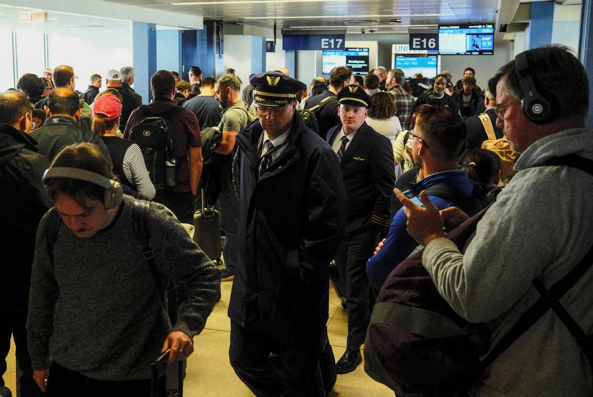 Pilots and passengers crowd a gate area as flight delays persist amid FAA measures more than a month into the ongoing U.S. government shutdown, at O’Hare International Airport in Chicago, Illinois, U.S., November 10, 2025.