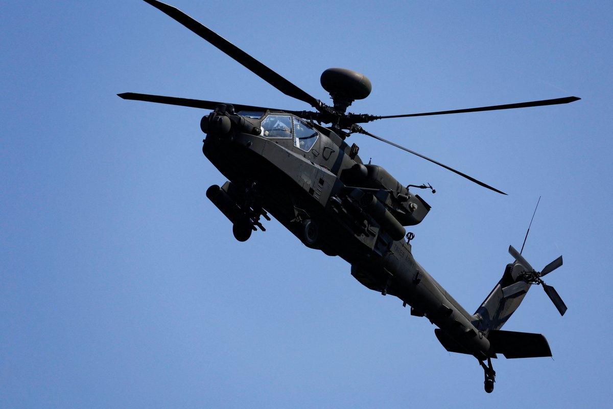 An AH-64 Apache helicopter flies during a live-fire drill of the U.S. Army’s 1st Armored Brigade Combat Team, 1st Armored Division at the Rodriguez Live Fire Complex, in Pocheon, South Korea, August 14, 2024.
