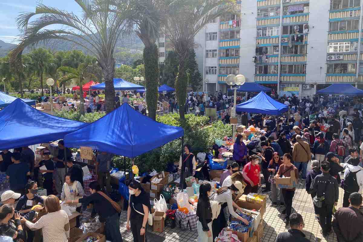 People visit a resource collection point set up by volunteers to provide supplies for residents impacted by the deadly fire, near the Wang Fuk Court housing complex in Tai Po, Hong Kong, China November 28, 2025.