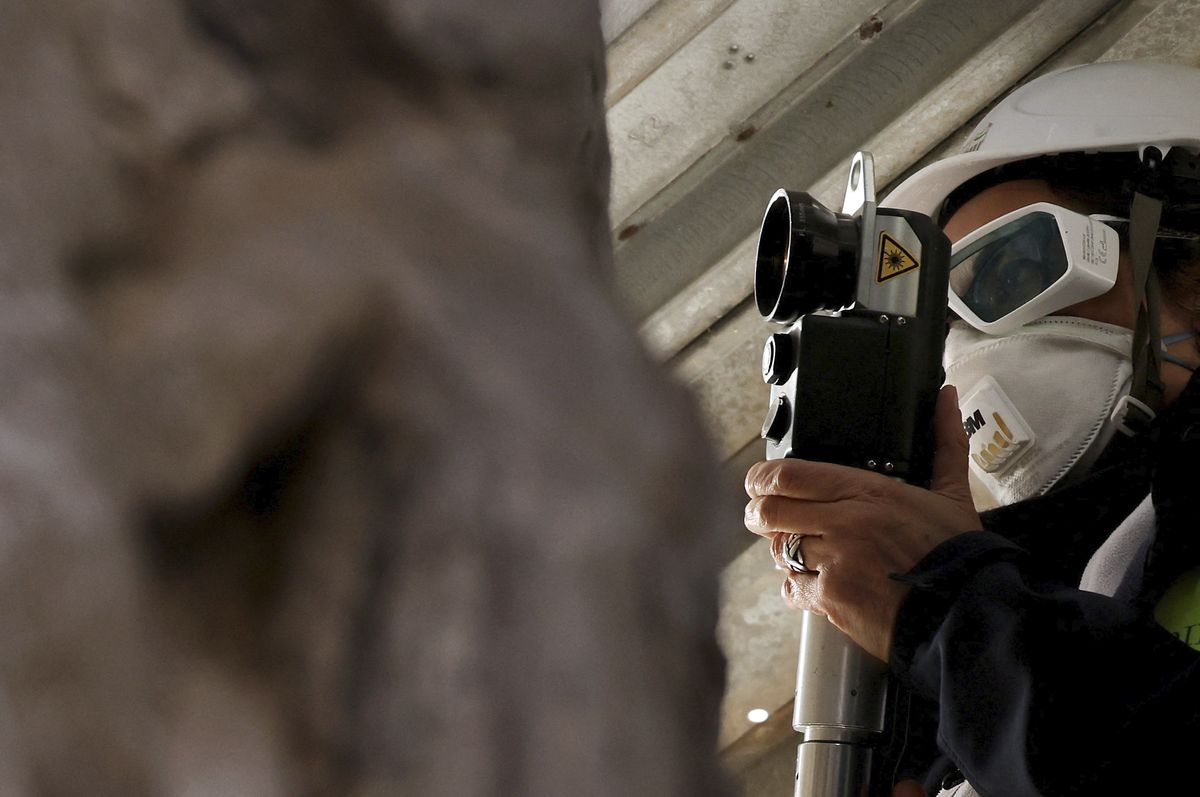The hand-held lasers concentrate flickering beams of light onto the stone, with the heat they generate lifting away black deposits of pollution to reveal the white Carrara marble beneath.