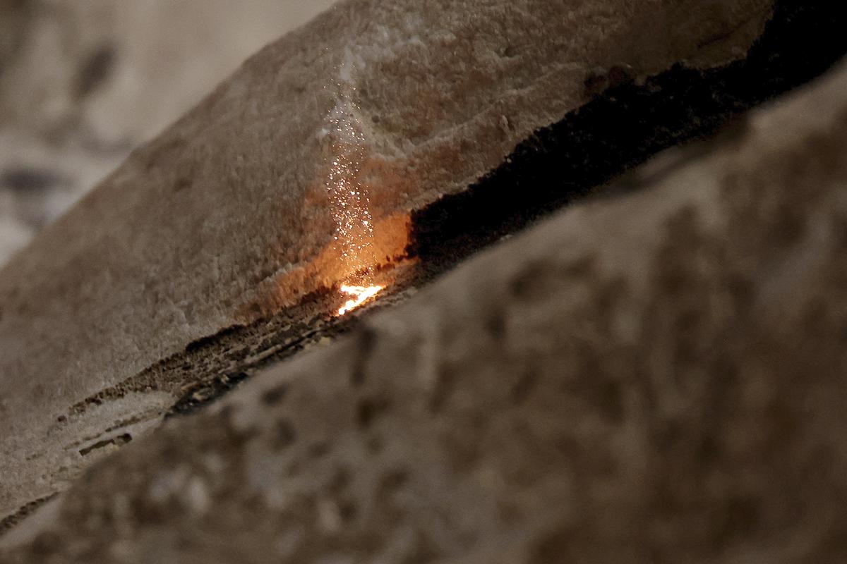 A worker uses a laser to clean a part of the Marcus Aurelius Column during restoration work. These photos were taken in Rome on Dec. 18.