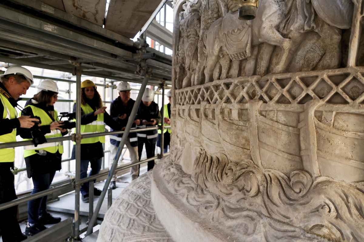 A portion of the Column of Marcus Aurelius as Marta Baumgartner, restoration project director and scientific director, center, speaks while standing on the scaffolding next to the column