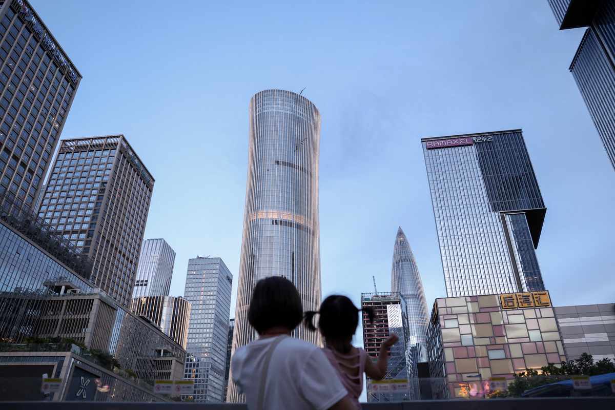 A woman holds a child near office buildings in Shenzhen, Guangdong province, China September 15, 2025.