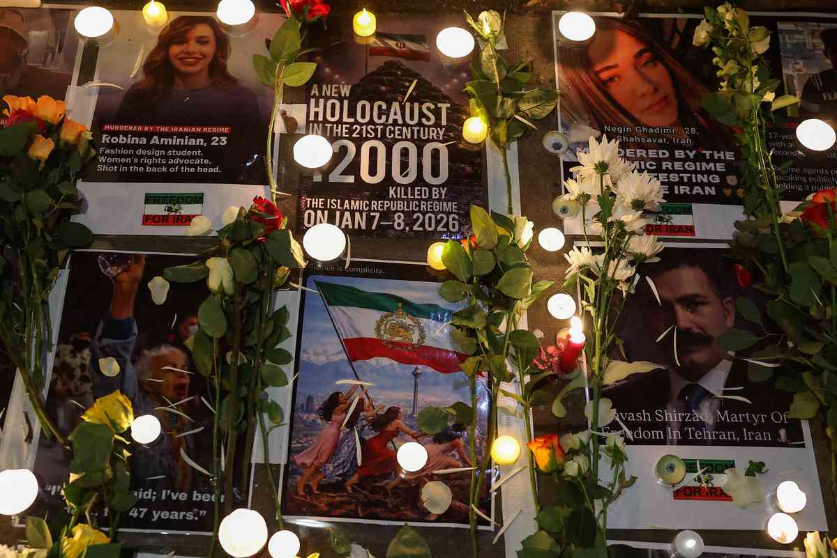 A candle-lit tribute with photographs of protesters believed to have been killed in recent protests in Iran, as demonstrators attend a gathering outside the Iranian embassy in support of nationwide protests in Iran, in London, Britain, January 18, 2026.