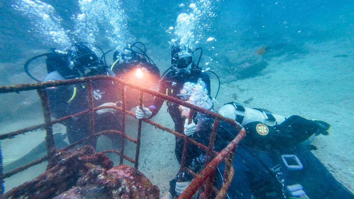 Balbine and a woman take a diving lesson before diving off the coast to retrieve bottles of wine.