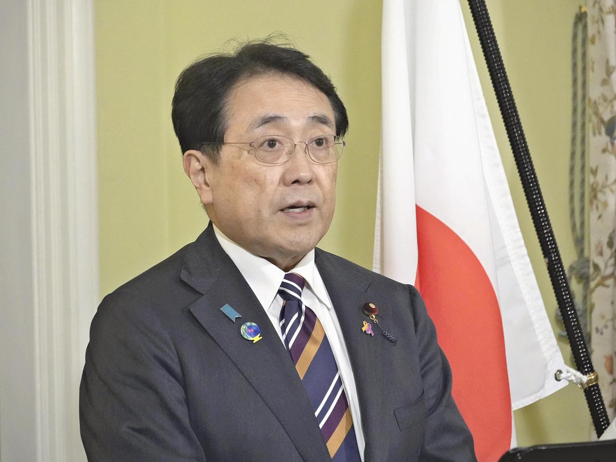 Economy, Trade and Industry Minister Ryosei Akazawa speaks to the press after talks with U.S. Commerce Secretary Howard Lutnick in Washington on Saturday.