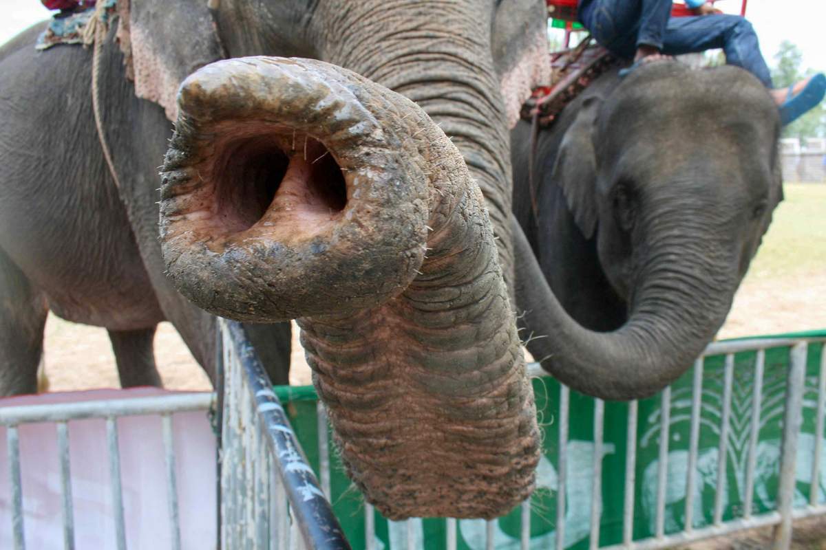 Two Asian elephants push their trunks over a stadium barrier and into the crowd at an elephant festival in Surin, Thailand, in November 2007.