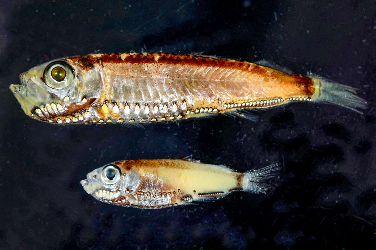 All three are small, with adults measuring roughly 3-7 centimeters long and the larvae much littler. They inhabit a marine realm of twilight conditions, with sunlight struggling to penetrate into the watery depths.