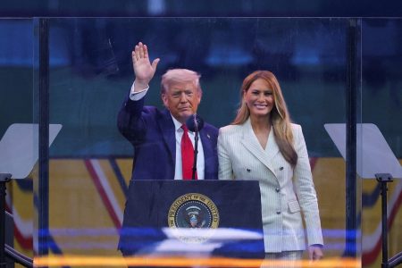 ReutersU.S. President Donald Trump waves next to first lady Melania Trump following the military par...