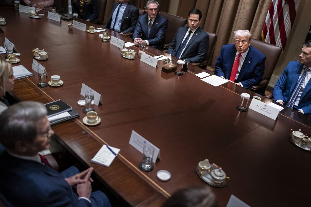 President Donald Trump, flanked by Secretary of State Marco Rubio and Defense Secretary Pete Hegseth, speaks during a Cabinet meeting at the White House on Thursday.