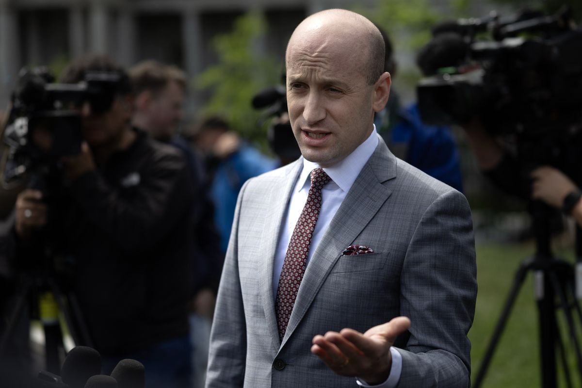 hite House Deputy Chief of Staff Stephen Miller speaks to reporters outside the White House on May 9 in Washington.