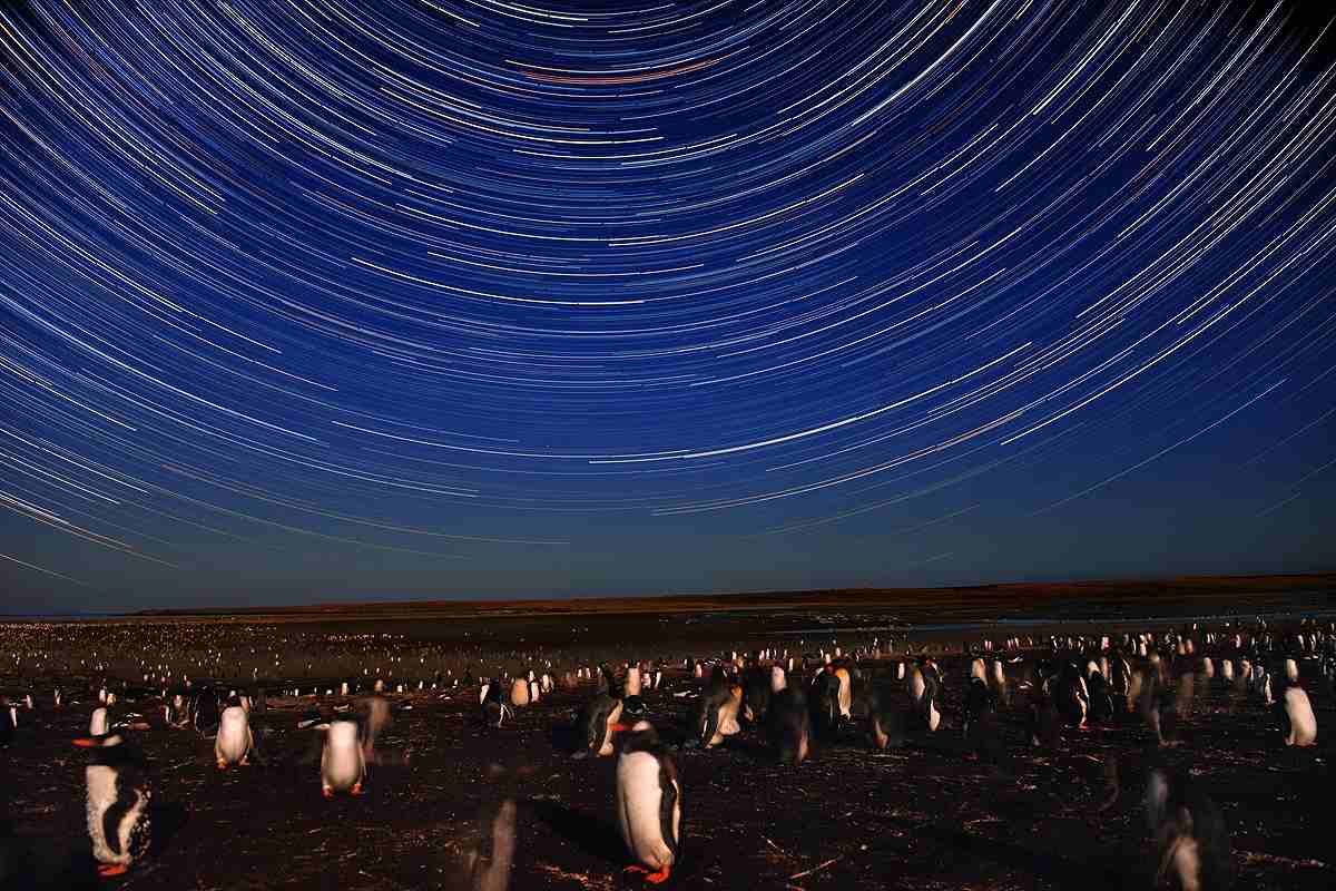 A composite of 216 images shows the trail of stars over colonies of Gentoo and King penguins in Bluff Cove, Falkland Islands.