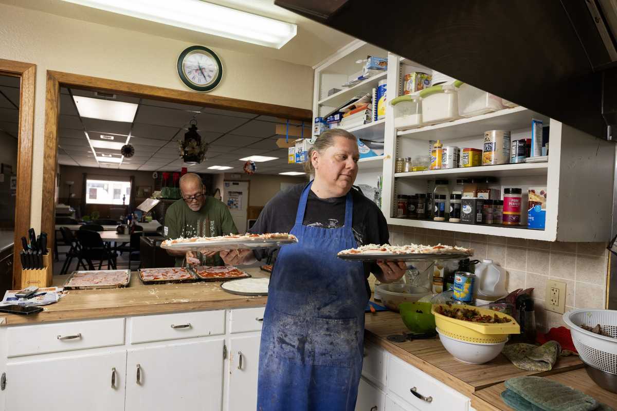 April Roberts, director of the Curtis Area Senior Center, makes pizzas to serve for lunch with help from her husband, Tom, in Curtis, Nebraska, on Friday.