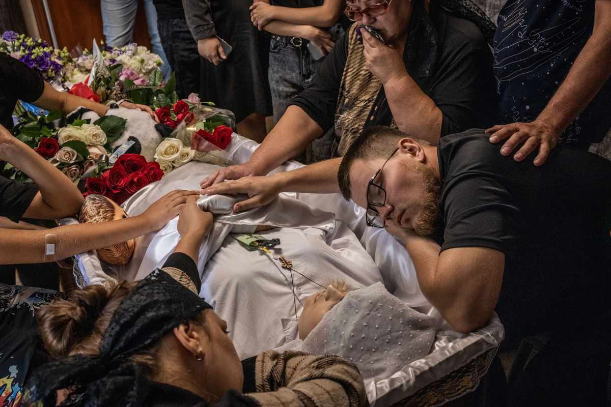 She lay in a wooden coffin in the center of the same room where she had filmed herself dreaming of motherhood. Sasha pressed his face to hers. Her mother, Lina, bent over her belly. Other relatives – her sister, Karina, her father, Anatolii, her nephew, Daniil – took turns caressing her face. They whispered to her and Damir, wishing them farewell.