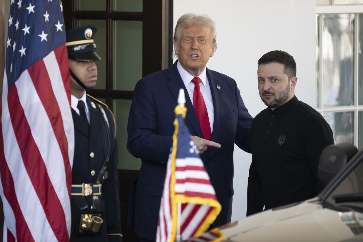 President Donald Trump greets Ukrainian President Volodymyr Zelensky outside the White House in February.
