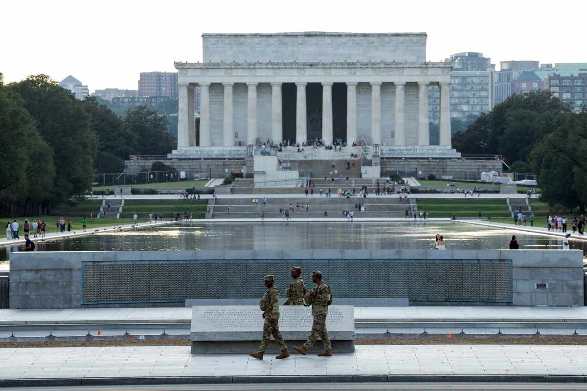 Members of the D.C. National Guard patrol near the World War II Memorial and Lincoln Memorial on Aug. 14.