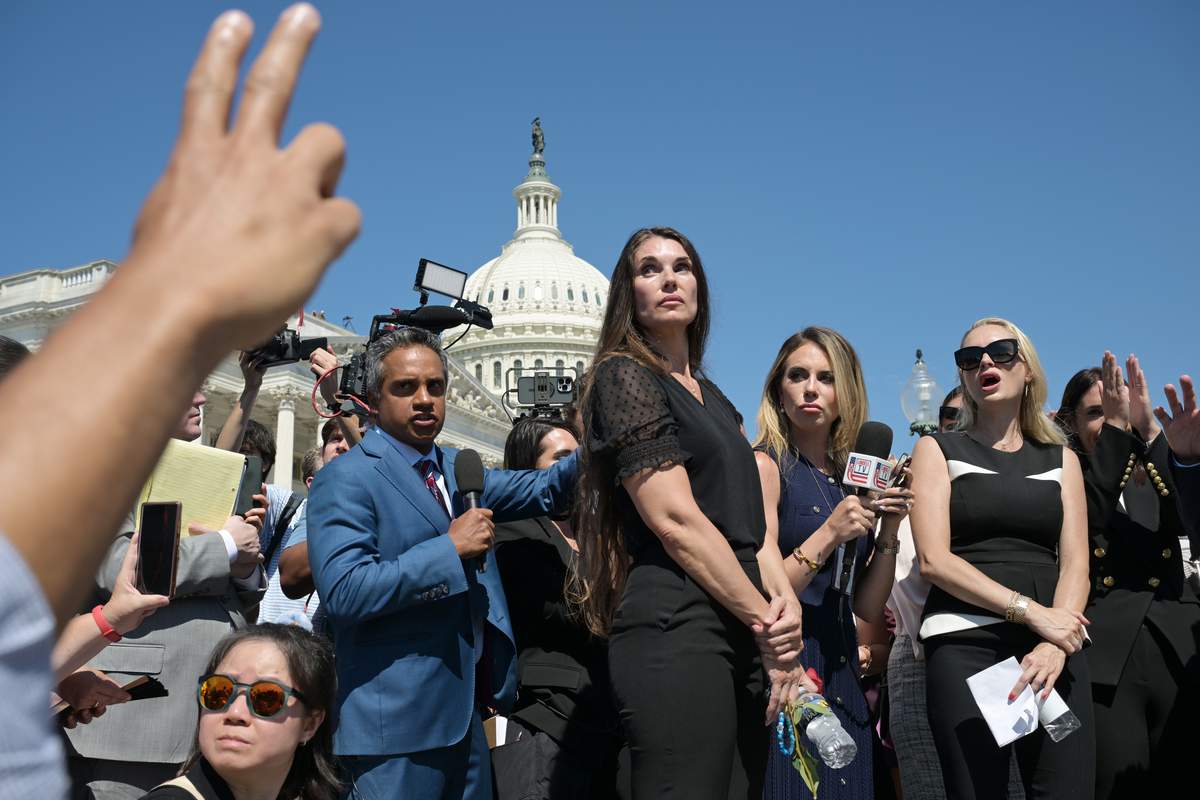 Anouska De Georgiou, right, gathers with other Jeffrey Epstein accusers at a news conference calling for the release of government files outside the U.S. Capitol on Sept. 3.