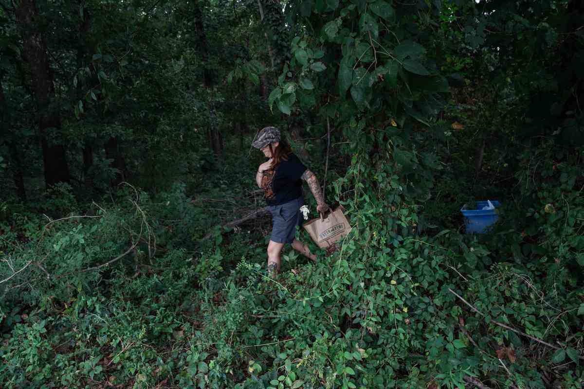 Lavender Timmons, executive director of Evansville Recovery Alliance, enters a wooded area in Evansville, Indiana, to collect used needles from a homeless encampment on Aug. 22.