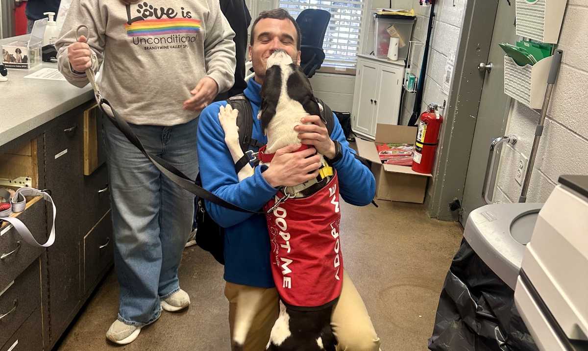 HayHay, a dog from a D.C. animal shelter, gives Kyle Melnick a warm greeting when they meet Oct. 16.