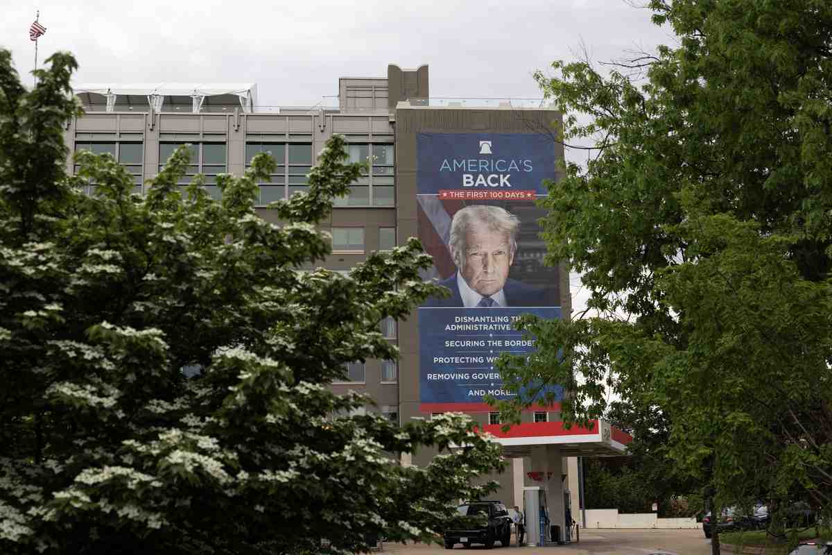 A banner of President Donald Trump hangs on the western face at the Heritage Foundation building near the U.S. Capitol in Washington.