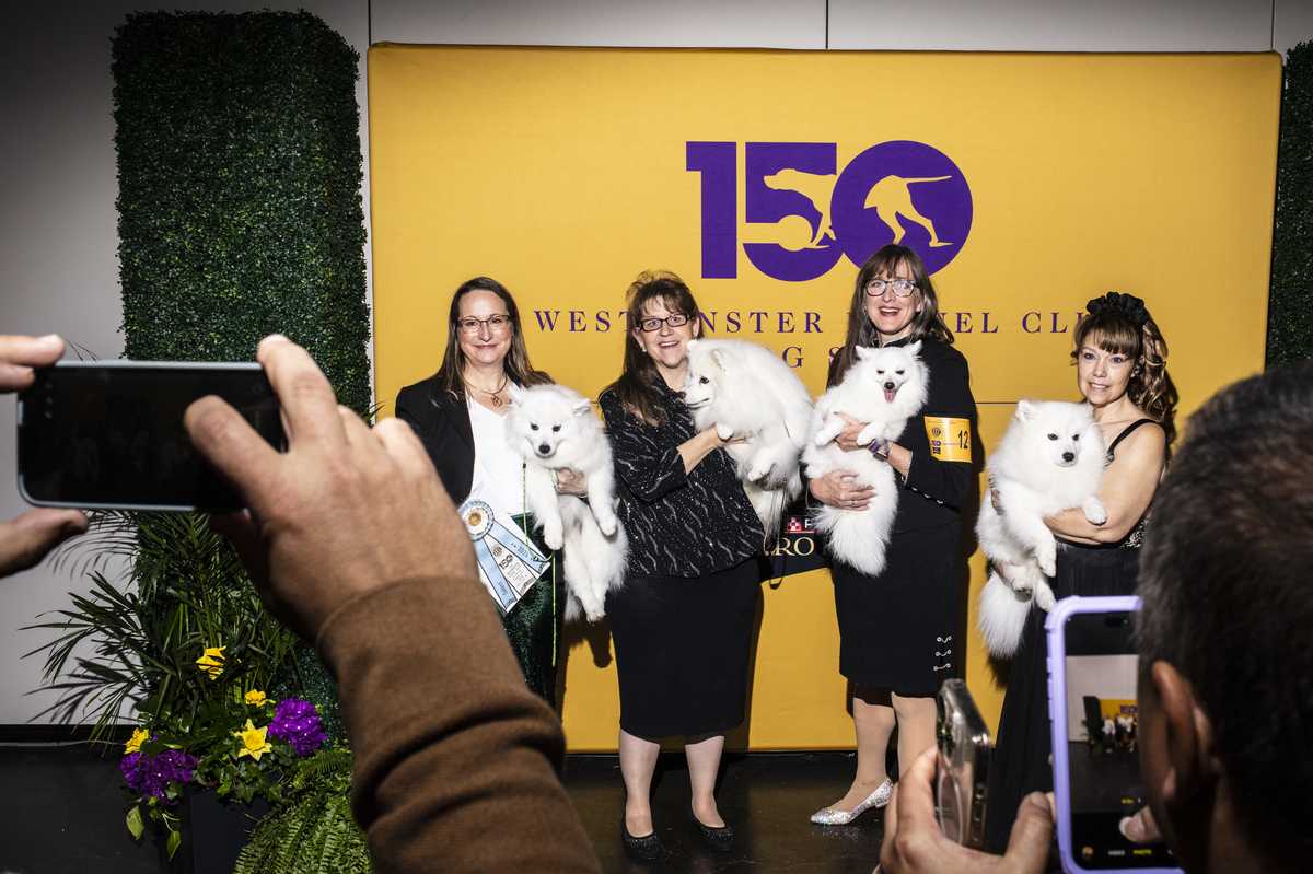American Eskimo dogs are pictured with their handlers during the Westminster Kennel Club Dog Show.