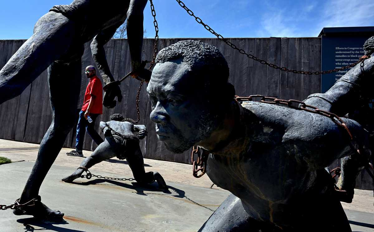 A work by Ghanaian artist Kwame Akoto-Bamfo depicting enslaved people in bondage is on display at the National Memorial for Peace and Justice in Montgomery, Alabama.