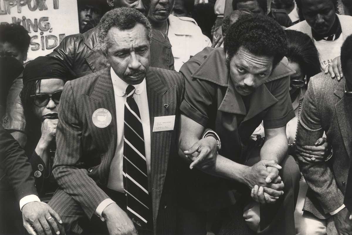 Rep. Parren Mitchell (D-Maryland), left, and Jesse Jackson pray on the sidewalk in front of the White House as they lead a march to the Capitol in 1985.