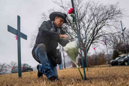 In muddied jeans and a wet black cowboy hat, Roberto Marquez built his makeshift memorial in the ...