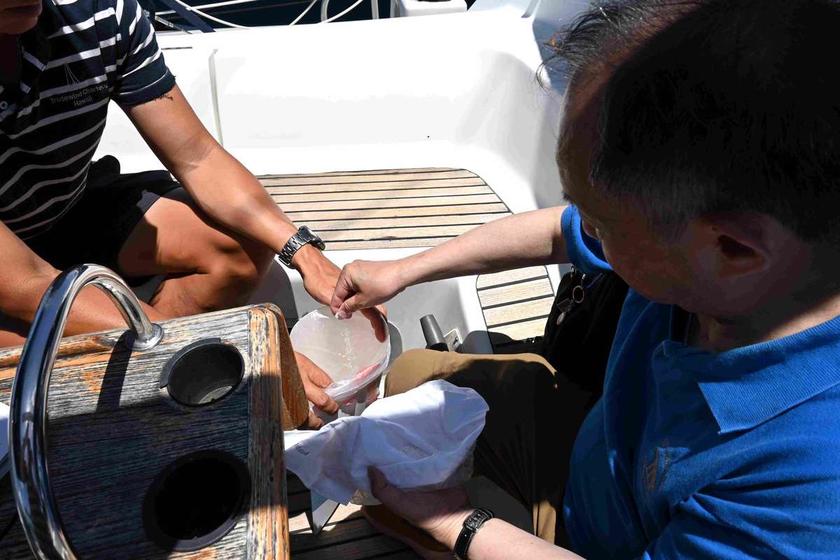 Seiki Keene, adopted son of Donald Keene, delivers a message to his father from a yacht floating in the sea off Honolulu before scattering Keene’s ashes, on June 6.