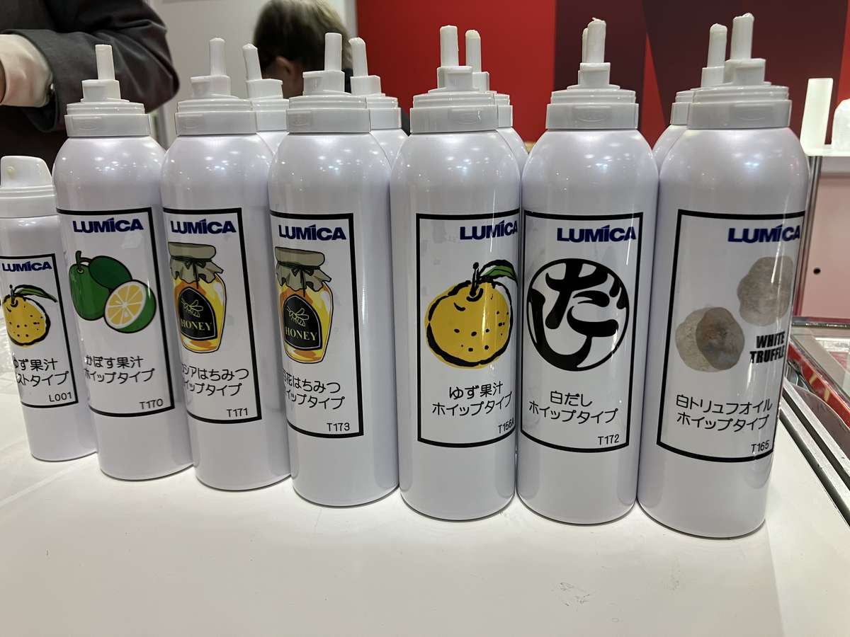 Eringi mushroom chips weren’t the only familiar food I saw in unfamiliar form. Dashi broth has been a basic element of Japanese cuisine for generations, but the Foodex was my first chance to encounter it in the form of a sprayable foam. Packaged in a can that looks like it might contain hairstyling mousse, the flavored foam comes from Lumica Corporation, a company known for producing lighted fishing lures and concert glow sticks.