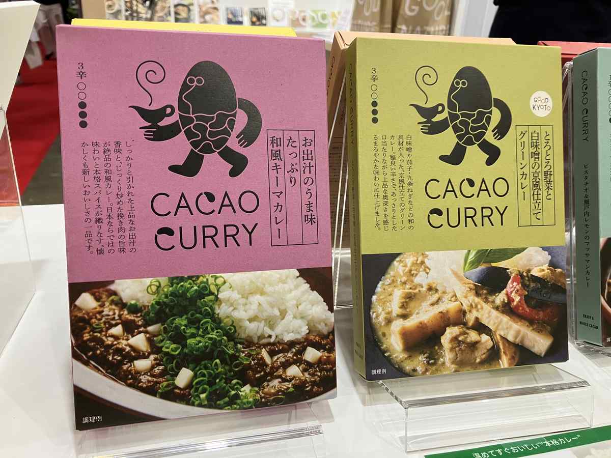 The Cacao Curry lineup from Kyoto-based Biostyle Co., founded in 2017, also looked innovative. The flavors on display — including green, keema and butter chicken — don’t sound especially chocolatey, but a sales manager at the booth told me that the curry is actually made with the husks of cocoa beans, less for the flavor than for nutritional benefits such as dietary fiber. Both he and the company’s website stressed that using cocoa husks was an environmentally friendly way to upcycle a material that would otherwise go to waste.