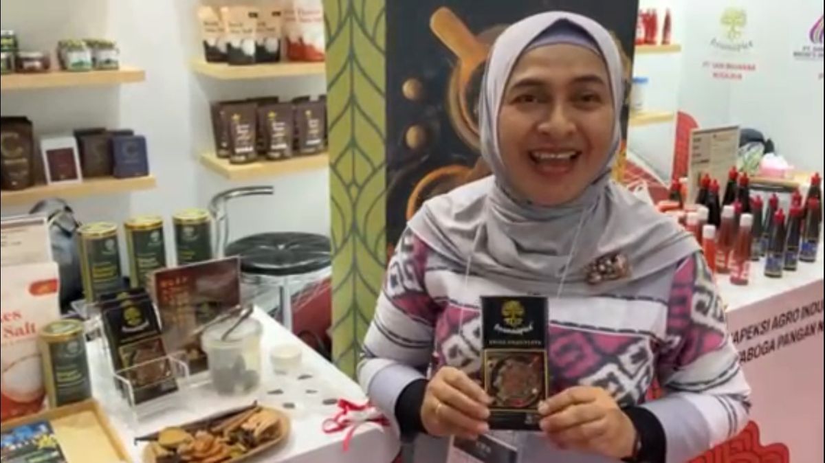 Sri Astutik displays a spicy chocolate bar from her company’s Aranaspice brand at the Indonesian pavilion.