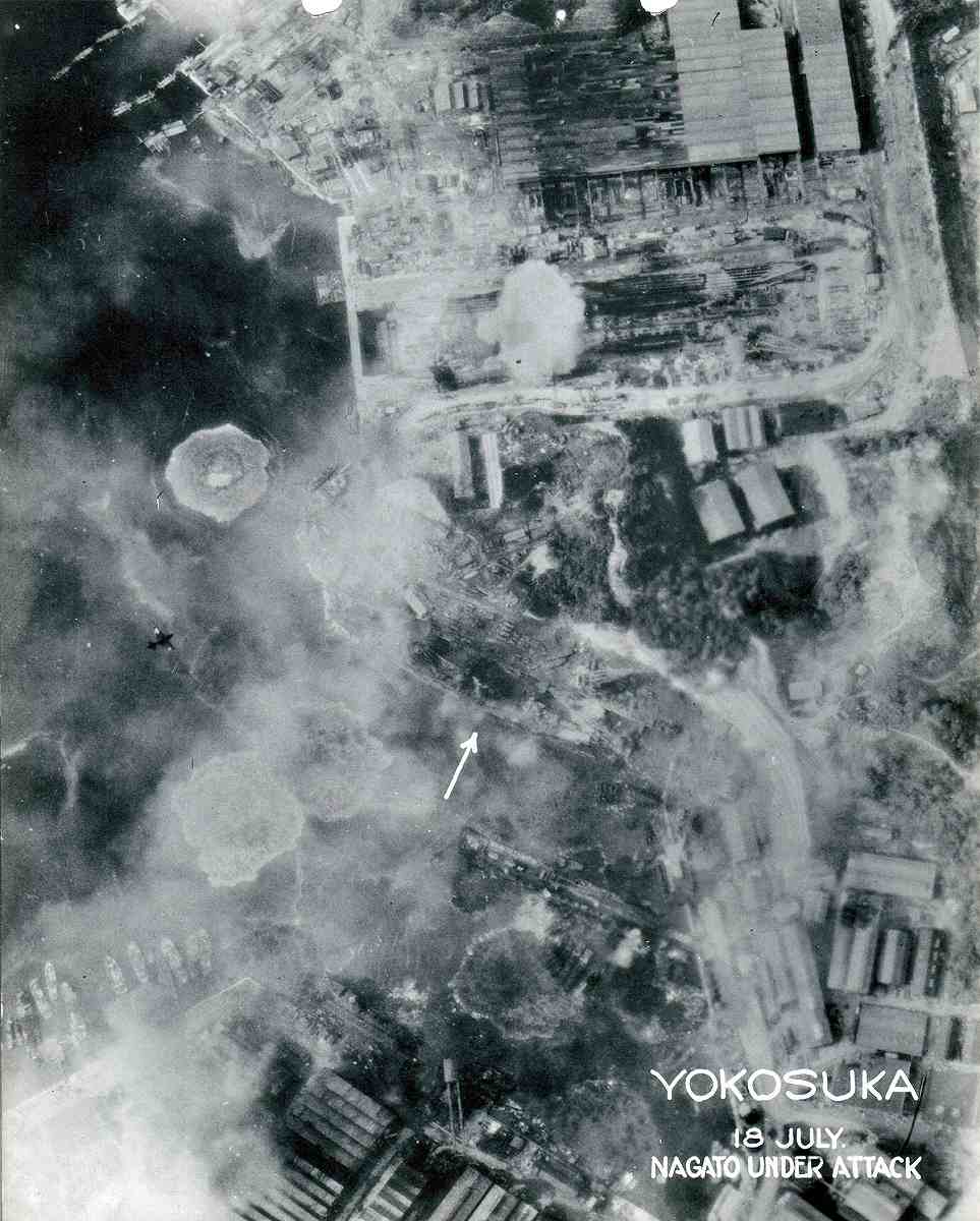 Yokosuka military port during an air raid, photographed from a U.S. military aircraft. The arrowhead shows the battleship Nagato. (This original photo is from the MacArthur Memorial in Norfolk, Va.)