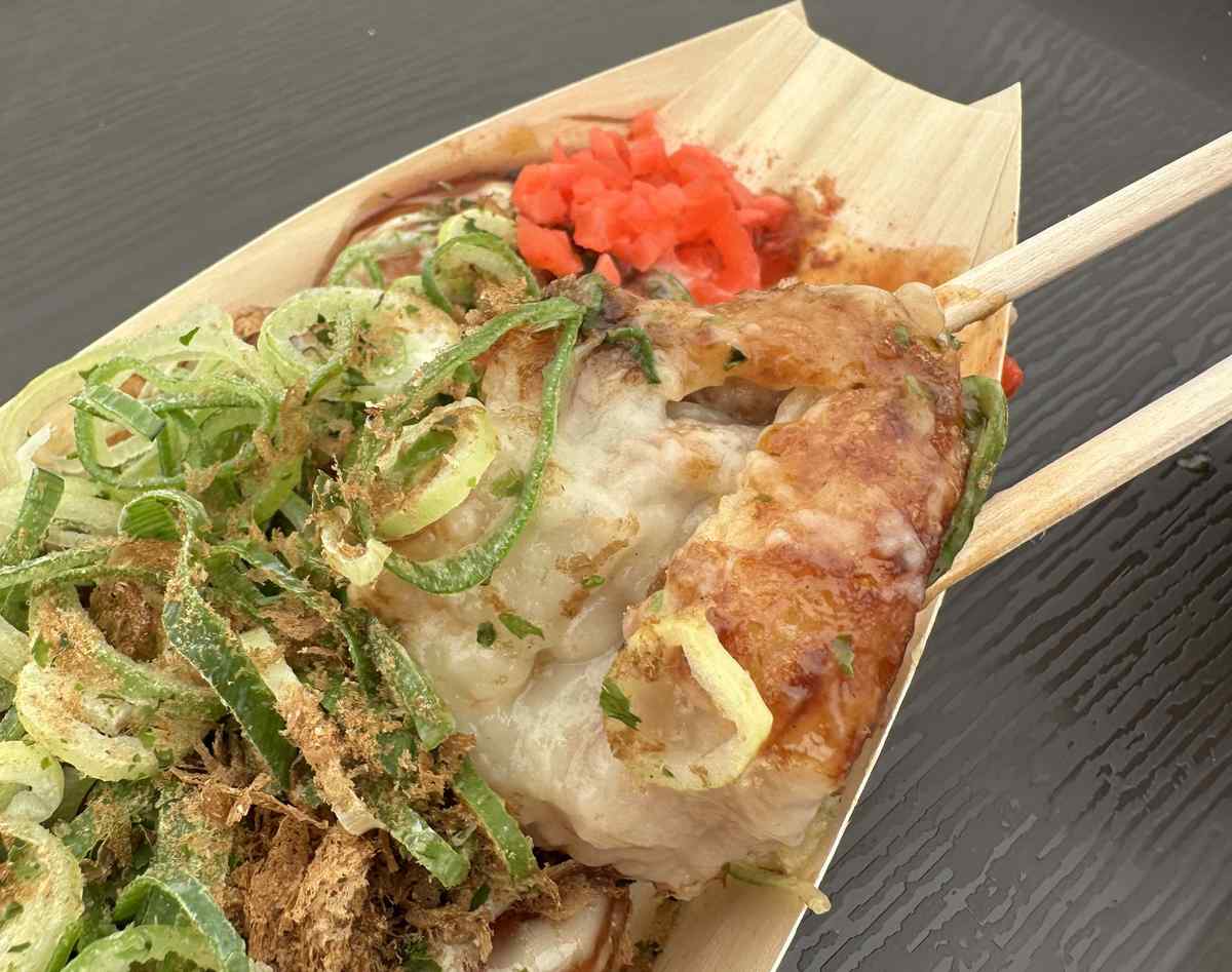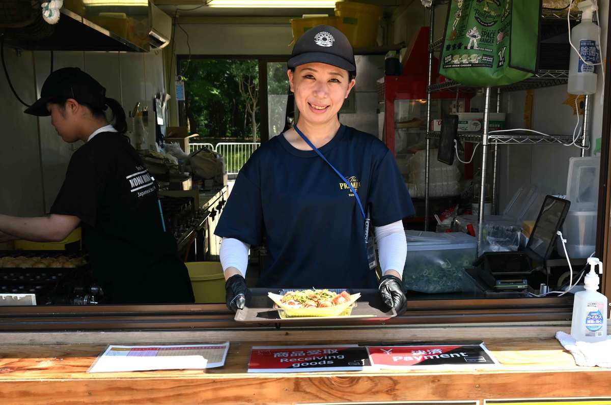 Next, I ordered takoyaki with sauce at Konamonya Hachi. The first thing I noticed was that the takoyaki balls were very big. The outside was crispy, and the inside was creamy, offering the perfect traditional texture. The flavor of the eight takoyaki balls, made with a secret, bonito-based dashi broth, along with bonito flakes, spring onion and green nori, exploded in my mouth. This eatery chain, which uses custom-made copper plates with excellent heat conductivity, originated in Nara and has grown to have over 40 shops nationwide. The stall manager, Ayaka Isobe, 35, saw the sweat pouring from my face and kindly offered me Coke.