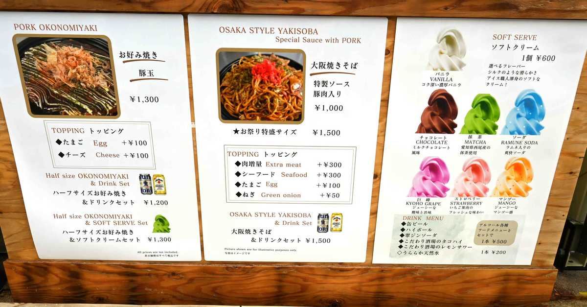 Clockwise from top left: okonomiyaki, takoyaki, 30 food stalls and horumon-yaki