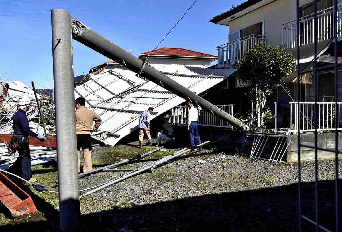 A utility pole damaged by a typhoon is seen in 2018 in Ibaraki Prefecture.