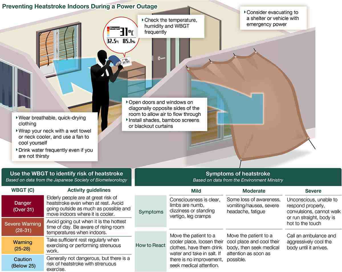 Miyake recommends installing a heatstroke meter or other device that displays the WBGT index at home to assess the risk of heatstroke. The Japan Meteorological Agency issues a “heatstroke alert” when the WBGT index is estimated to be 33 C or higher. “On days when temperatures are expected to rise, consider evacuating to a shelter with an emergency power supply or to an air-conditioned car, and take action as soon as possible,” said Miyake.