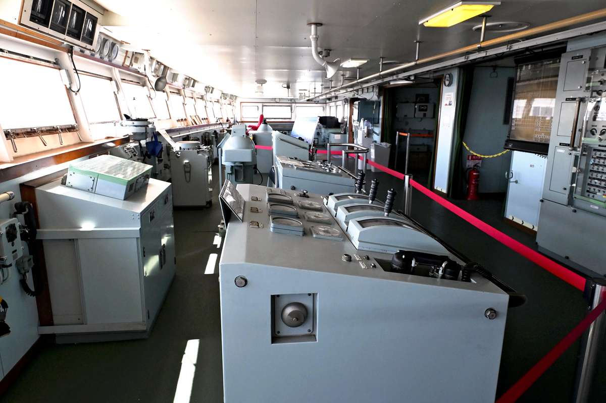 Guided by Saigusa, I went to the bridge, where the ship was steered. The spacious area has a steering wheel similar to that of a car, and a lever to adjust the propeller’s rotation speed.