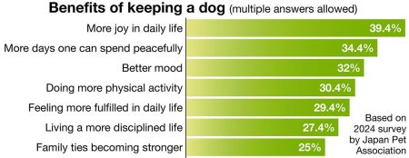 Furthermore, according to a survey this year of 581 women age 50 to 83 by think tank Harumeku Age Marketing Inc., those who keep pet animals, such as dogs and cats, have a higher happiness level than those who do not by 0.38 percentage points. Their average cost per month of keeping a pet was ¥20,603. As for negative things about keeping a pet, 55.1% cited that they cannot travel or go out for a long time, and 32.7% chose animals’ shedding hair.