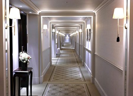 The carpeted hallway stretches on straight ahead. Antique-style lamps line the walls, casting a gentle light on the ceiling and floor. Time passes slowly in this elegant space inside a major train terminal used by 1 million people daily.